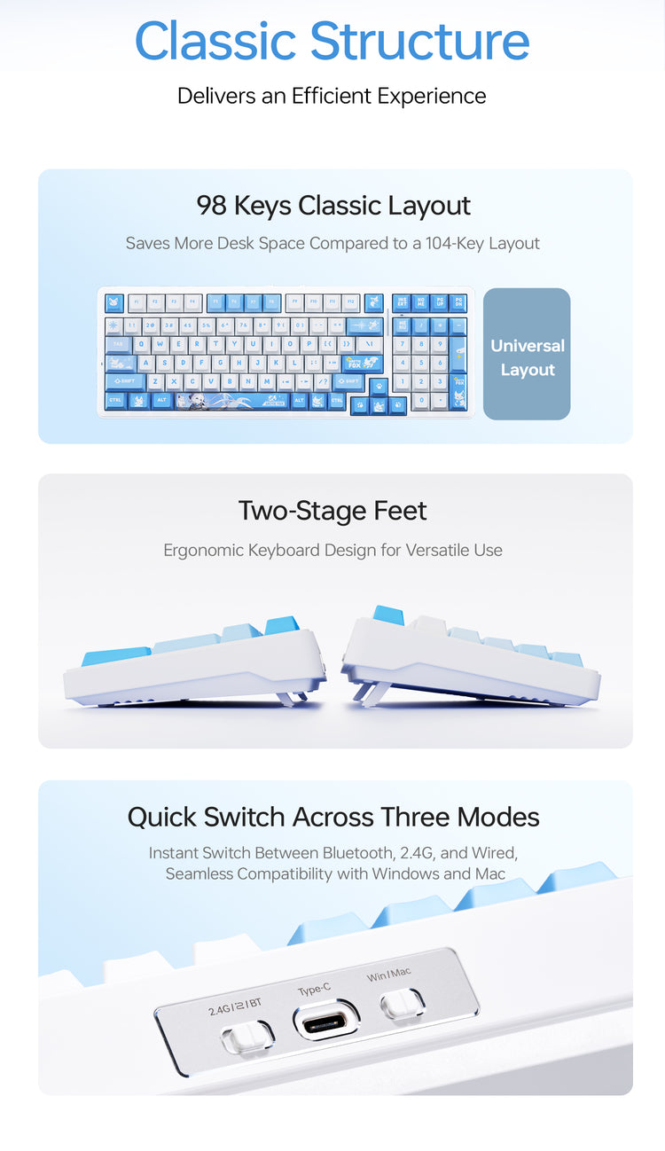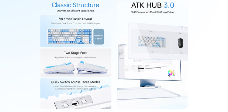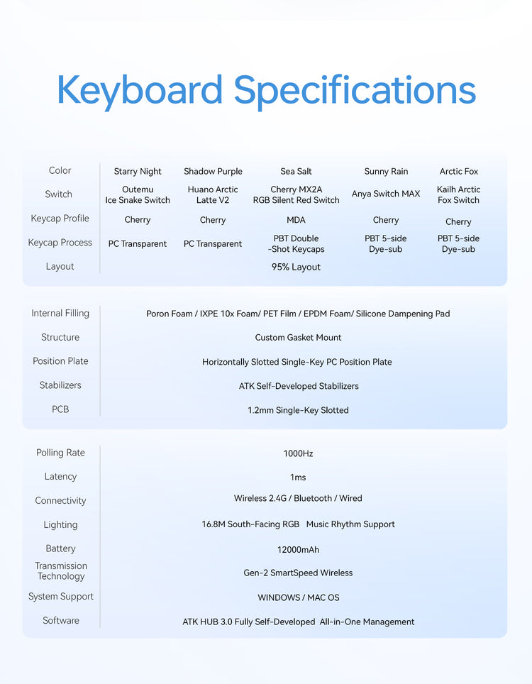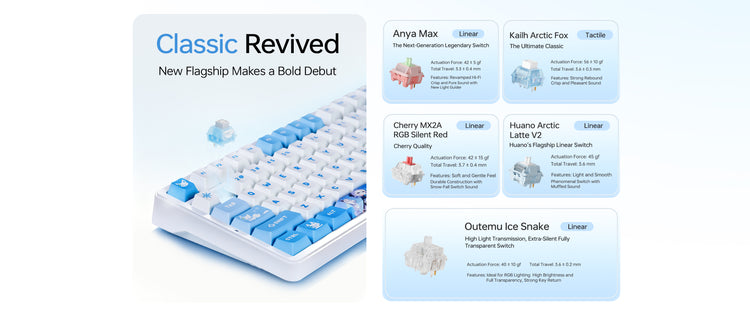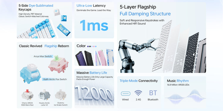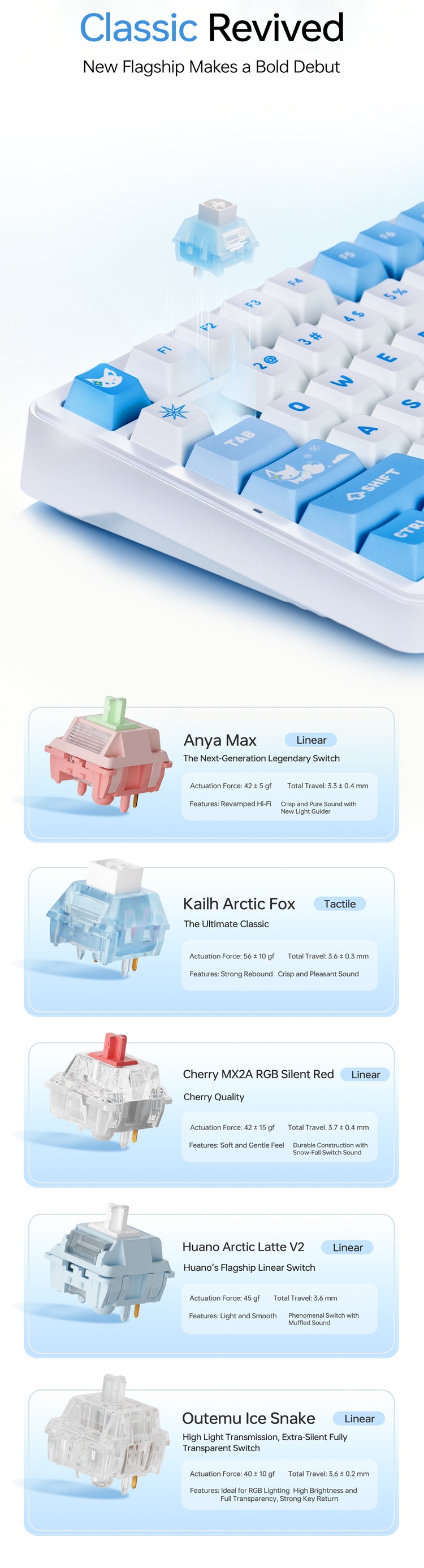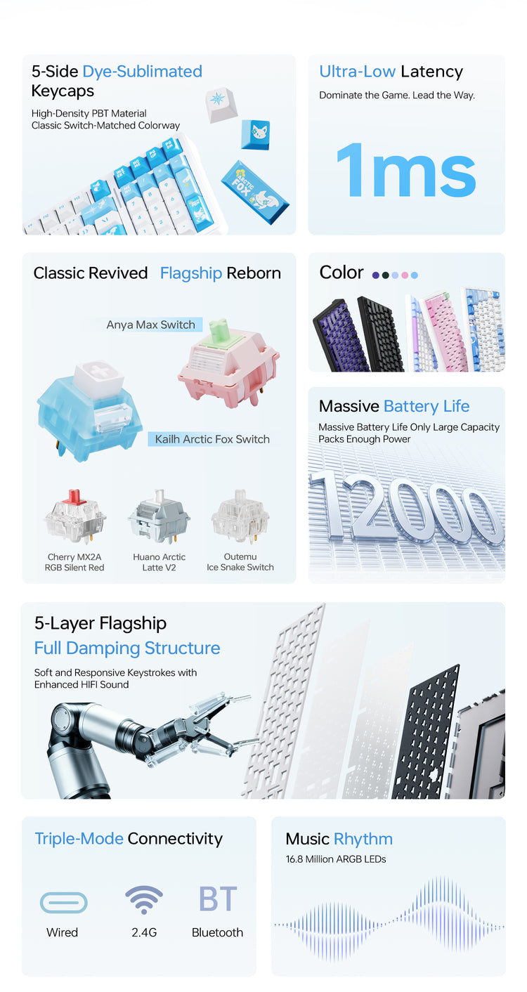Classic layout with a signature colorway. With a 12,000mAh high-capacity battery, top-tier performance, and all-around optimization, experience a truly elevated mechanical keyboard like never before.