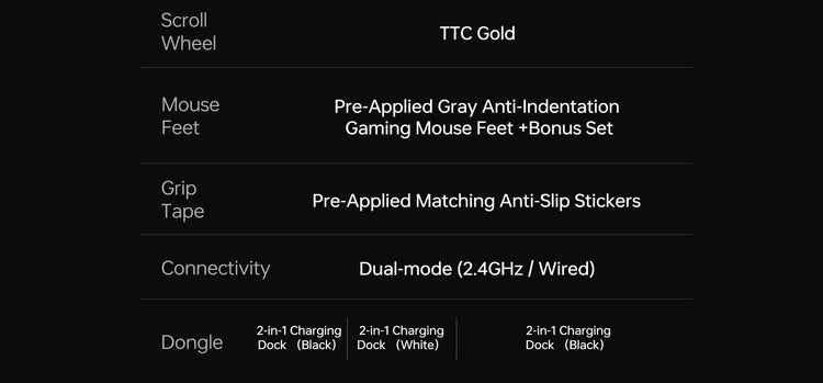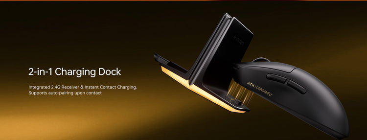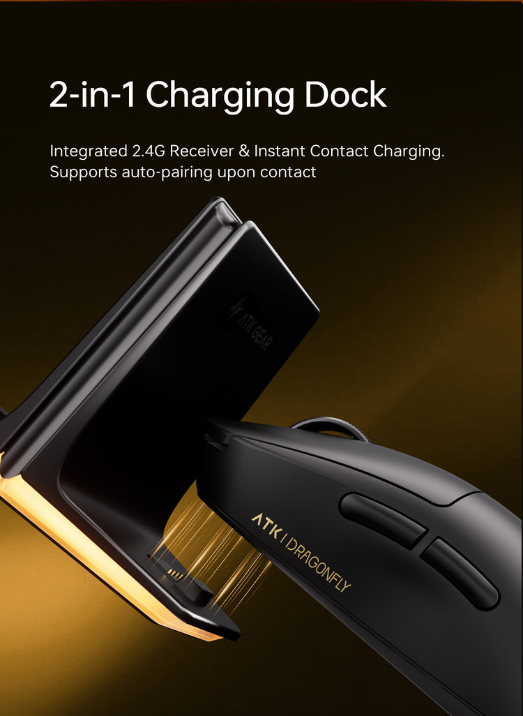 Experience flagship performance with our all-in-one 2-in-1 charging dock, featuring an integrated 2.4G receiver, instant contact charging, and auto-pairing upon docking for seamless and convenient use.