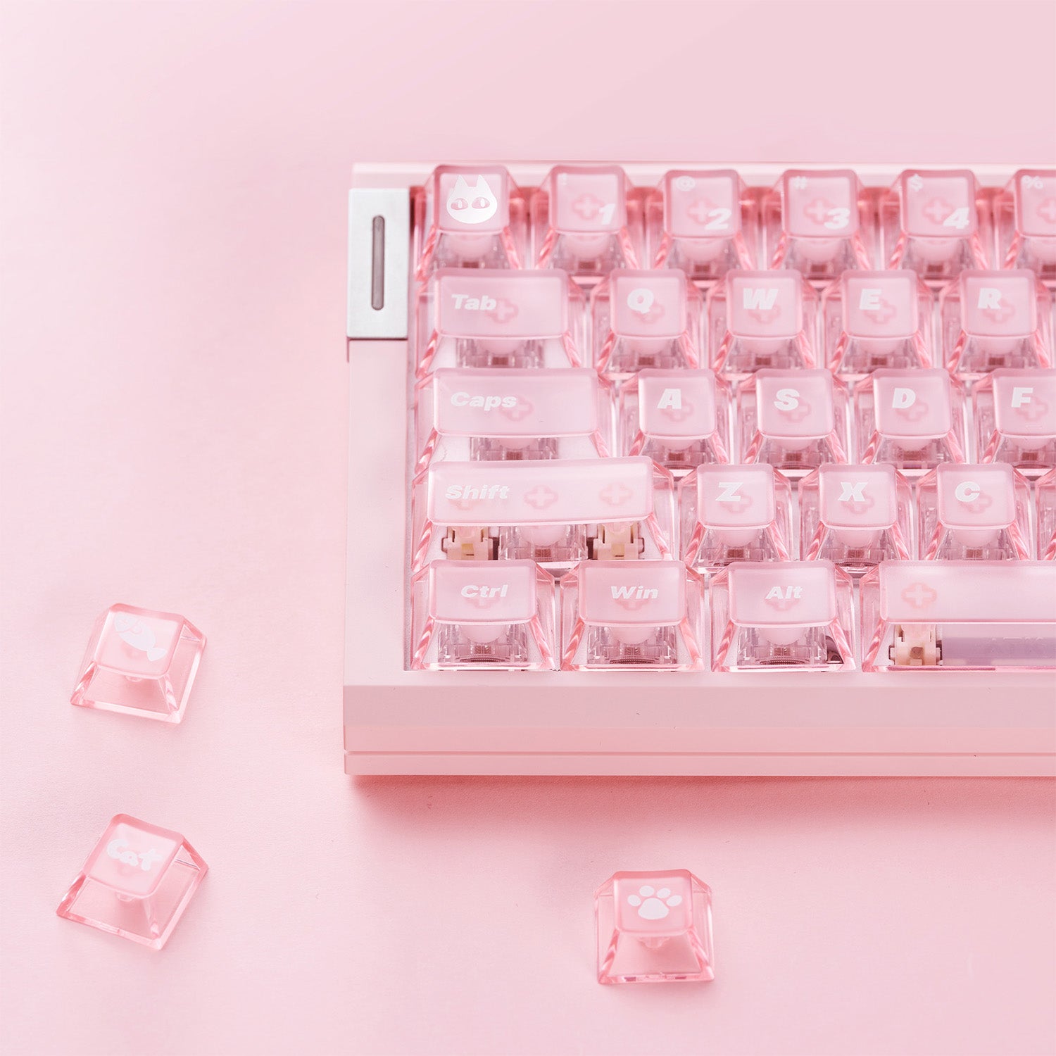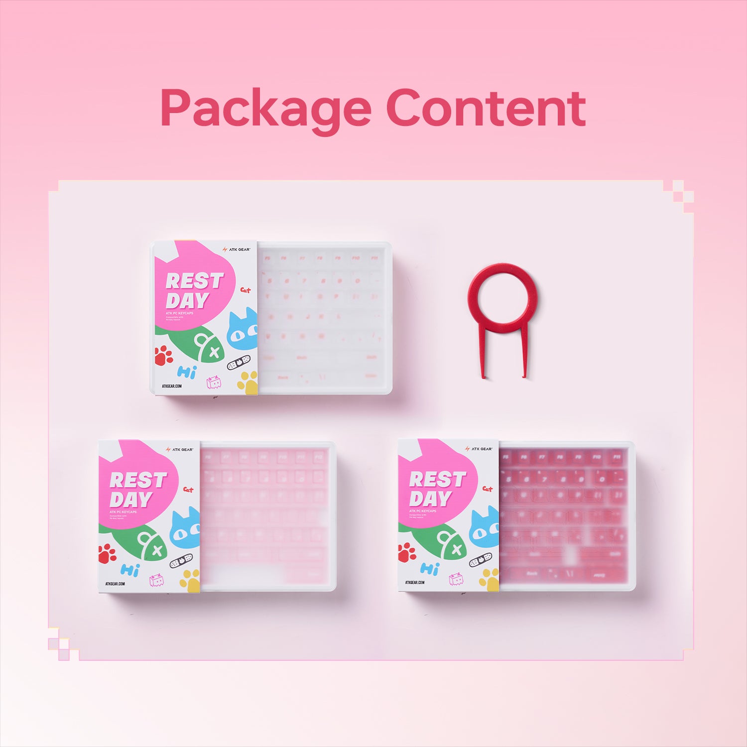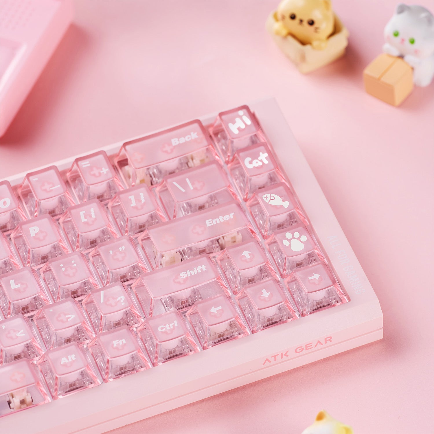 Featuring a top-frosted translucent surface with a transparent surround, oil- and fingerprint-resistant performance, Cherry profile for optimal finger tracking, including original cute cat-themed keycaps, and full compatibility with ATK keyboards.