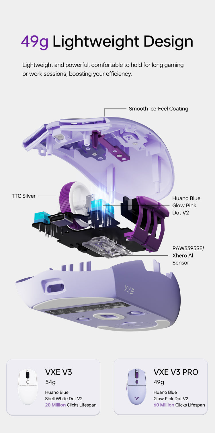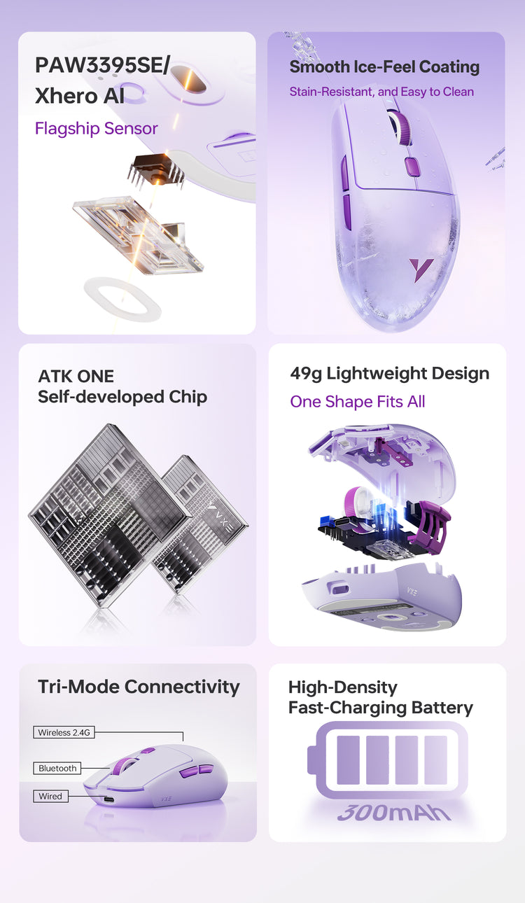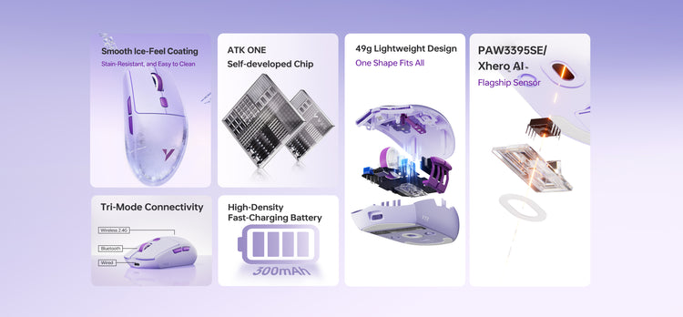Lightweight 49g wireless mouse with a smooth, ice-feel coating and versatile tri-mode connection. Its all-in-one ergonomic design fits small to medium hands.